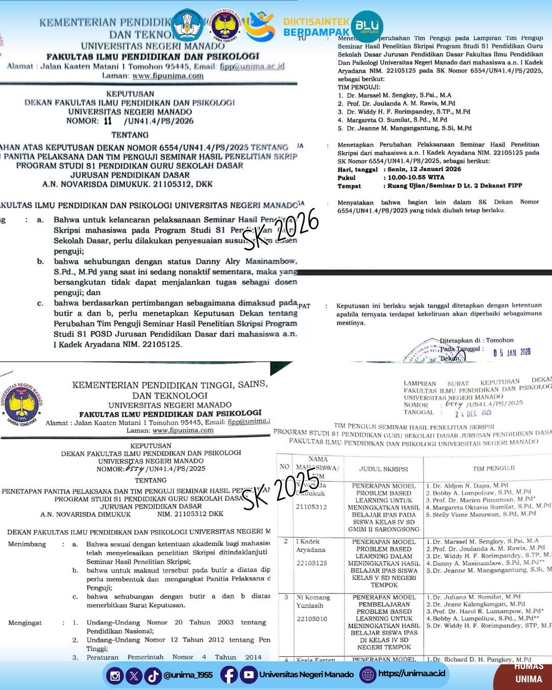 Penjelasan serupa juga disampaikan oleh salah satu mahasiswa Program Studi PGSD FIPP Unima, I Kadek Aryodana, yang namanya tercantum dalam SK ujian tersebut dan diketahui merupakan mahasiswa bimbingan akademik DM.