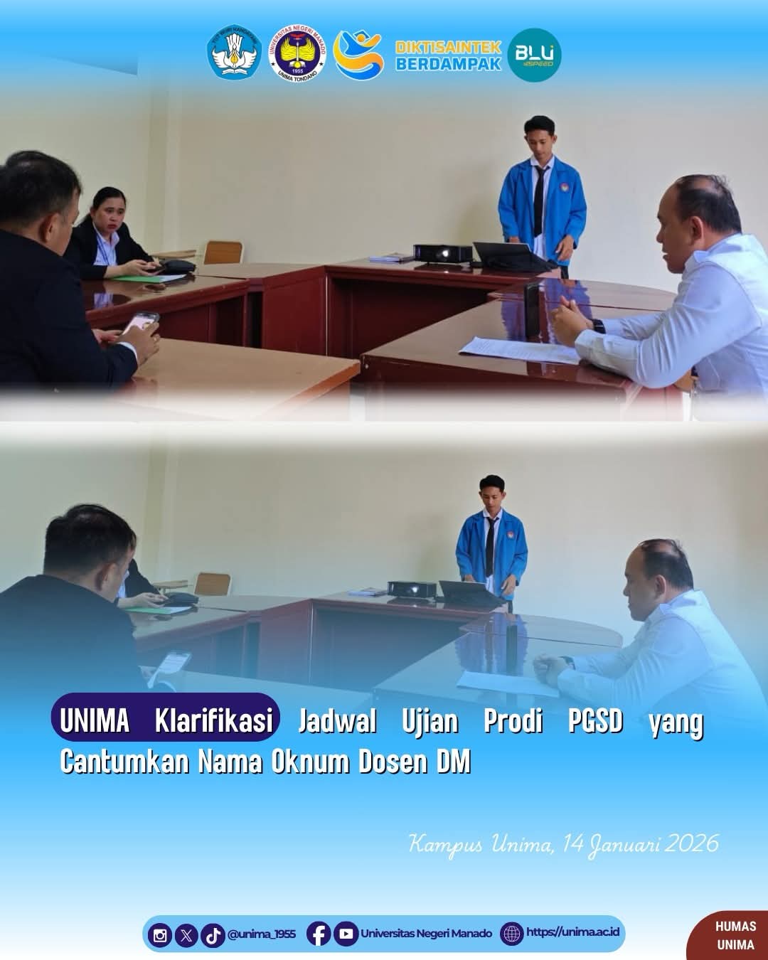 Klarifikasi disampaikan langsung oleh Dekan FIPP Unima, Dr. Aldjon Nixon Dapa, M.Pd., saat diwawancarai pada Rabu (14/1/2026). Ia menegaskan bahwa dokumen yang beredar merupakan jadwal ujian lama yang disusun sebelum status DM dinonaktifkan oleh pihak Unima.